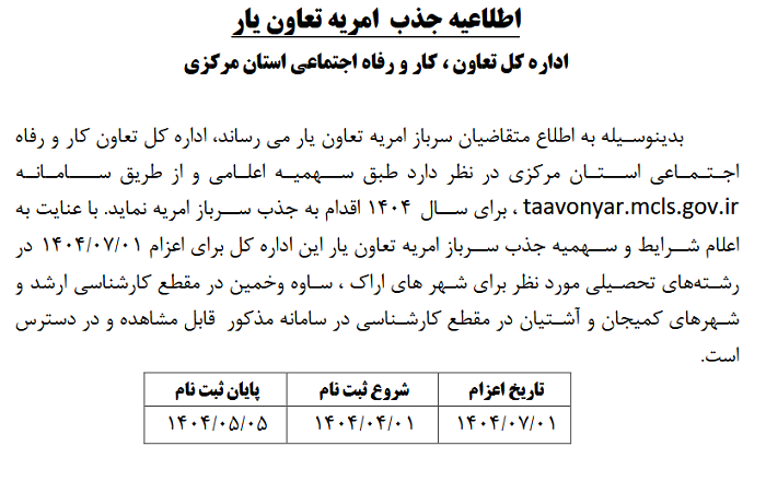 اطلاعیه جذب امریه تعاون یار ۱۱ تیر ۱۴۰۴ | ۱۲:۰۴ کد : ۵۲۷۴۸ اطلاعیه ارسال به دیگران نام شما ایمیل شما ایمیل دریافتکننده ارسال انصراف تعداد بازدید:۱۲۳۶ اطلاعیه جذب امریه تعاون یار
