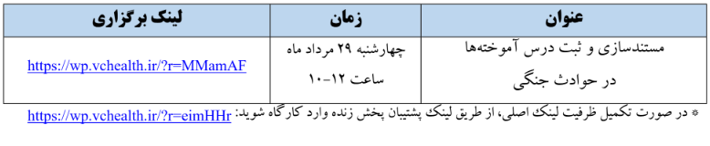 برگزاری کارگاه های غیرحضوری مدیریت بحران و بلایا با محوریت مستند سازی و ثبت درس آموخته ها در حوادث جنگی