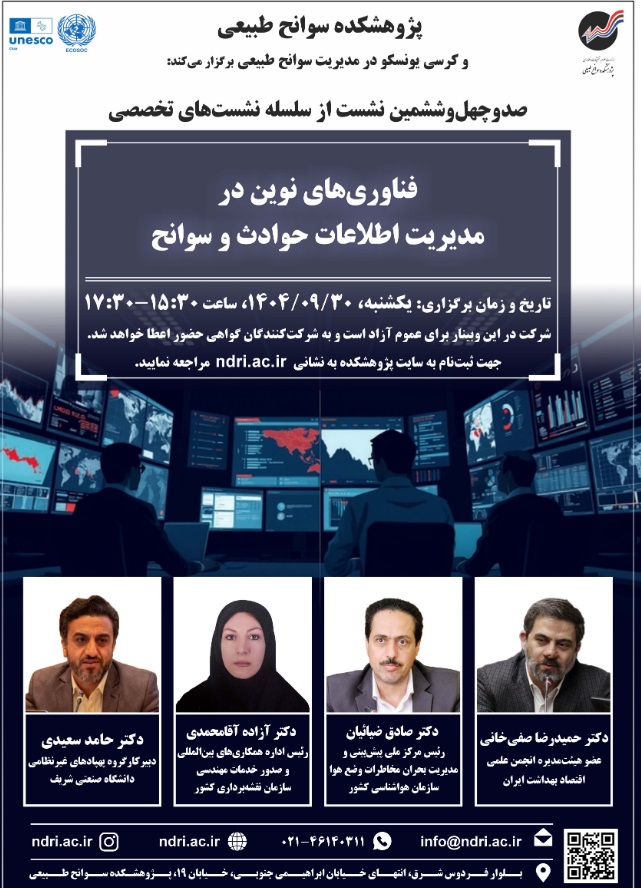 نشست فن آوری نوین در مدیریت اطلاعات حوادث وسوانح ۳۰ آذر ۱۴۰۴ | ۱۲:۰۴ کد : ۵۷۱۴۹ اطلاعیه ارسال به دیگران نام شما ایمیل شما ایمیل دریافتکننده ارسال انصراف تعداد بازدید:۱۱۳ دعوتنامه نشست فن آوری نوین در مدیریت اطلاعات حوادث وسوانح